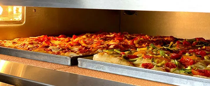 Supercharged baking chamber specifific for Roman style tray-baked pizza.