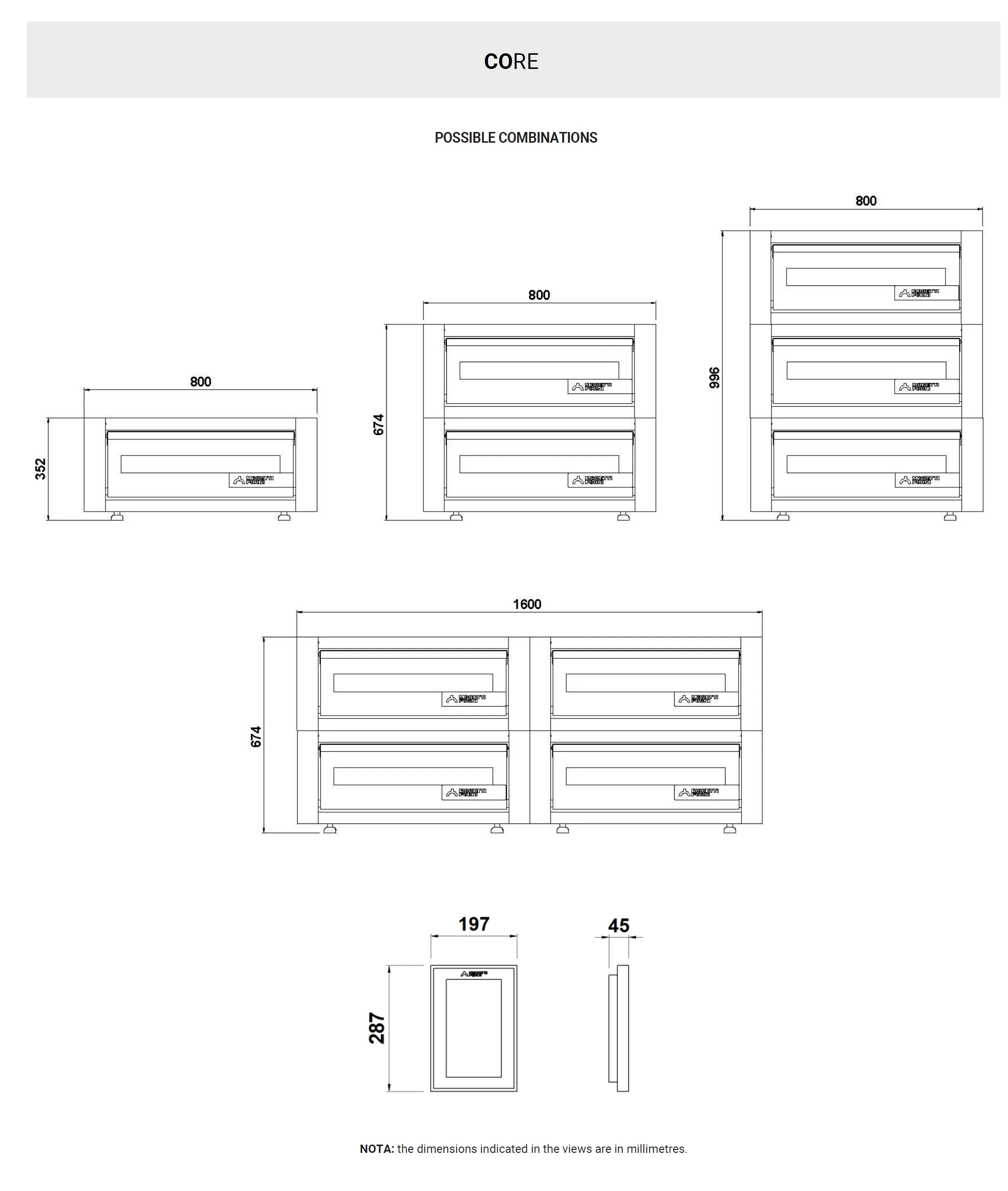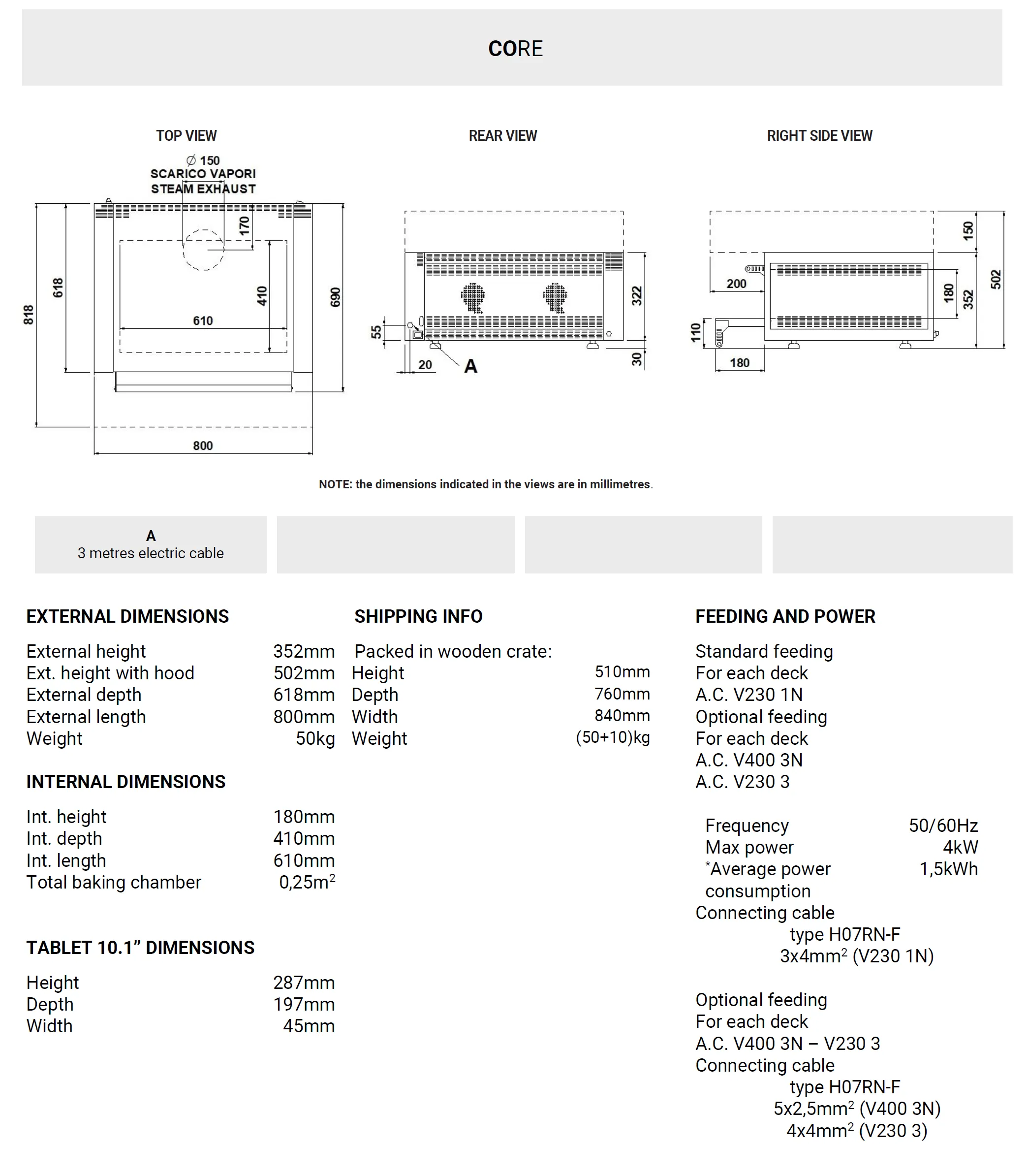 Refining® oven Core consists of a deck specifically designed for Refining®, using Condecktion® technology, which is the combination of static heating elements and controlled ventilation. This grants a direct heat distribution over the entire surface of the deck, for direct baking or baking with trays. The oven control is located on a removable tablet that can manage several interconnected modules. Electronic temperature management. Bottom-hinged door with tempered crystal glass for a perfect view of the product being heated. Core is stackable and also available with hood on request. Maximum chamber temperature: 290°C.