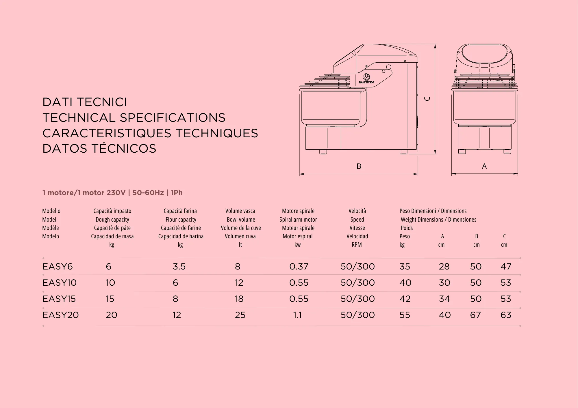– Maximum dough capacity respectively 6-10-15-20 kg.