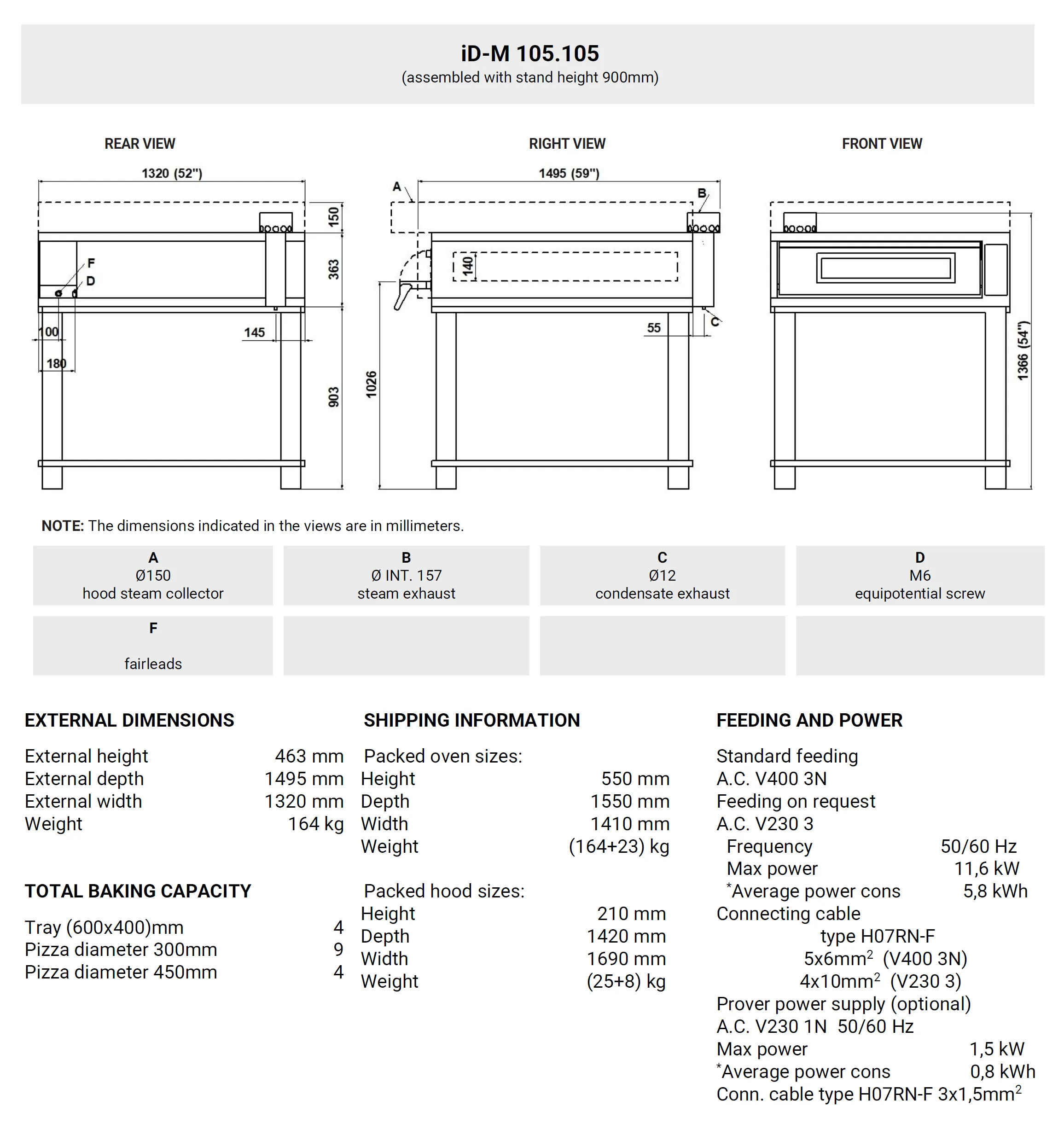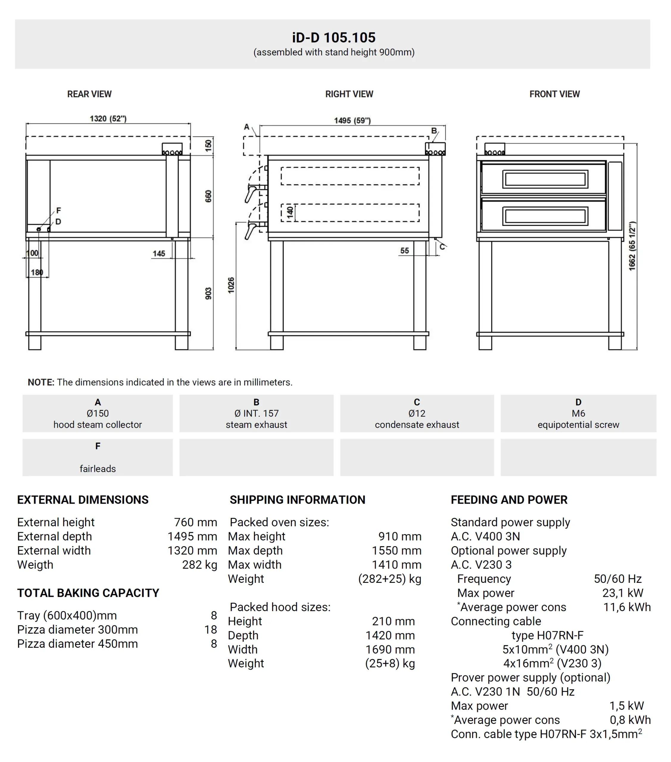 iDeck consists of one or two baking chambers and an optional prover or stand. The oven’s baking surface is made of refractory material, providing the perfect heat distribution over the whole surface. This oven is particularly suitable for direct or indirect pizza baking. Temperature management is electronic, power control of ceiling and floor is independent. The oven door is hinged at the bottom, with a tempered glass window to check the product during baking. The stand consists of a painted metal structure, while the prover is a stainless steel cabinet equipped with a heating thermostat. The prover can reach the maximum temperature of 65°C(149°F), whereas the maximum temperature of the baking chamber is 450°C (842°F).FUNCTIONING