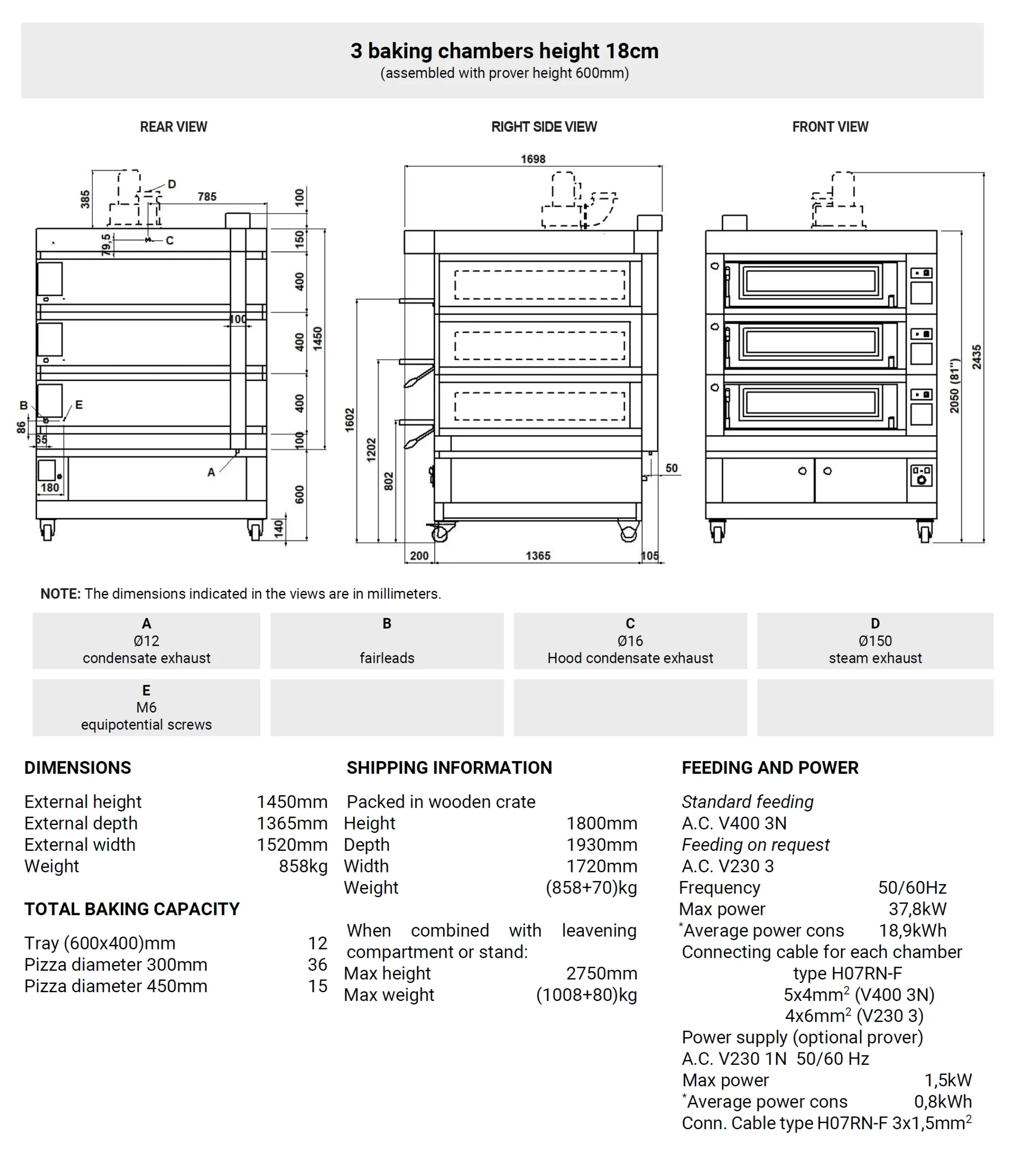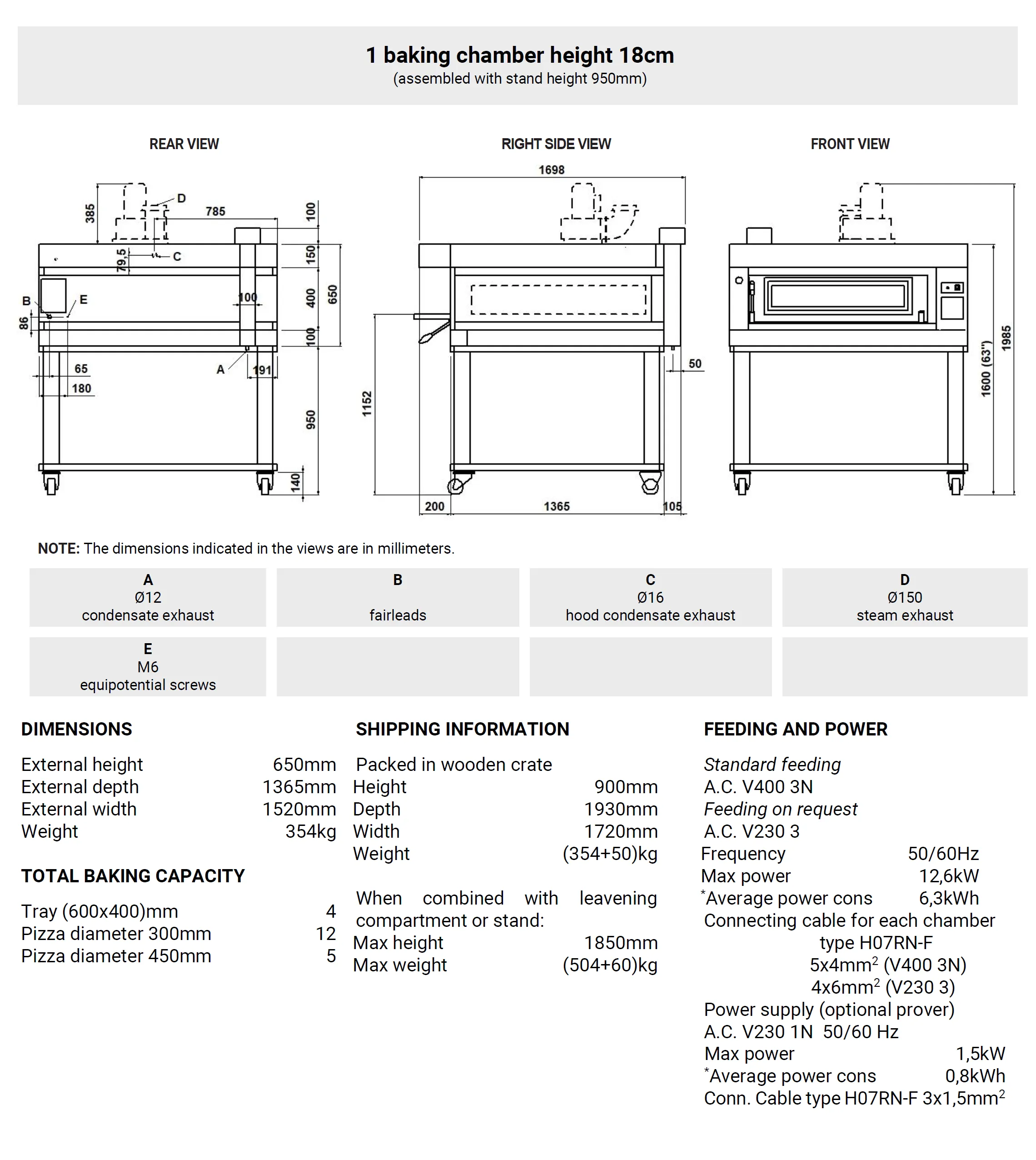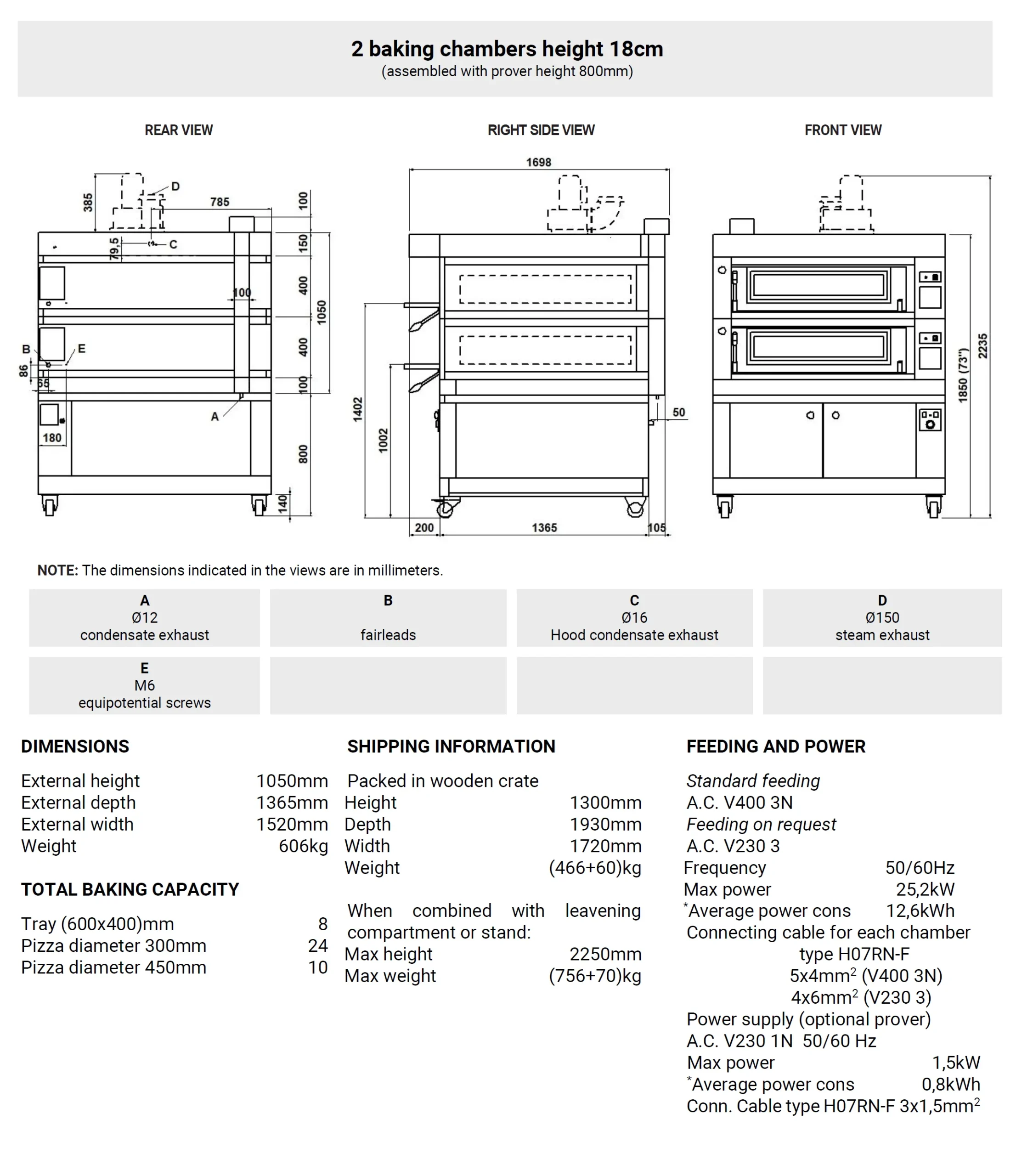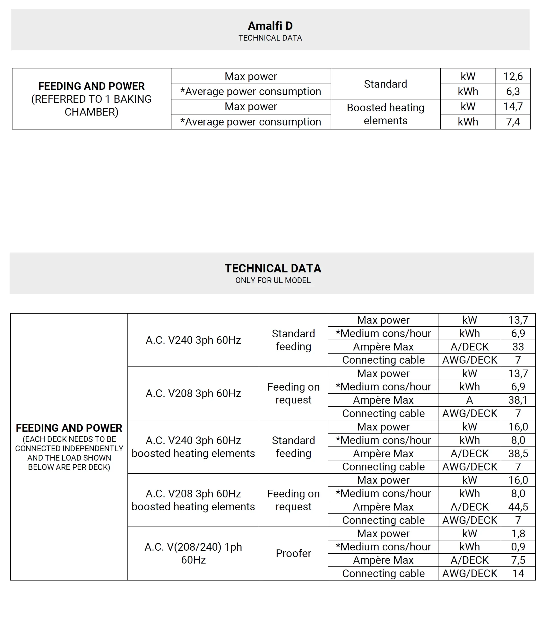 Amalfi consists of one or more independent baking chambers and an optional prover or stand. The baking chamber is entirely made of refractory stone with coiled heating elements inside, allowing the perfect heat distribution over the whole surface. This oven is particularly suitable for direct pizza baking, specific for more delicate toppings and recommended for indirect baking on trays. Temperature management is electronic, power control of ceiling and floor is independent. The oven door is hinged at the bottom, with a tempered glass window to check the product during baking. The stand consists of a painted metal structure, while the prover is a stainless steel cabinet equipped with a heating thermostat. The prover can reach the maximum temperature of 65°C(149°F), whereas the maximum temperature of the baking chamber is 450°C (842°F).