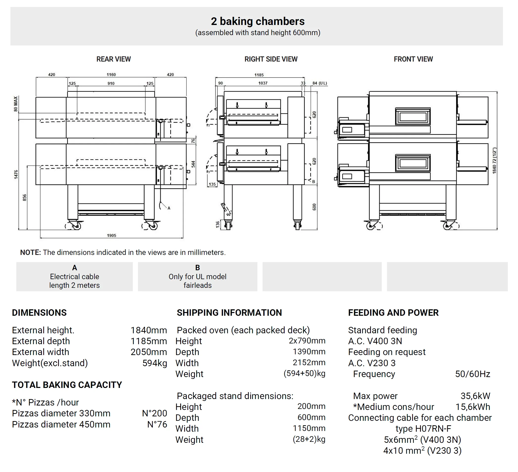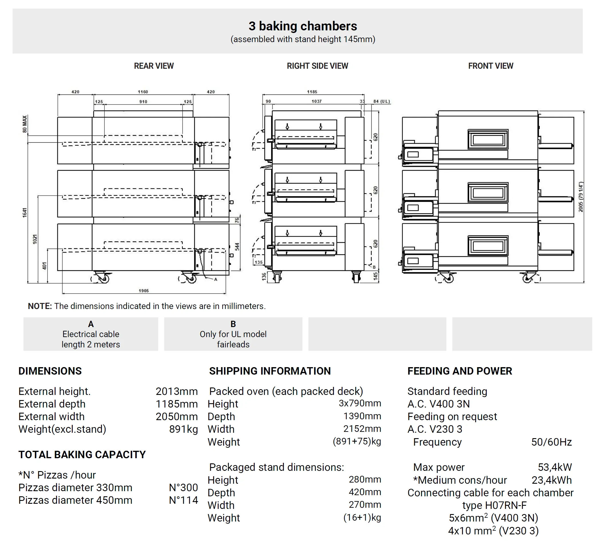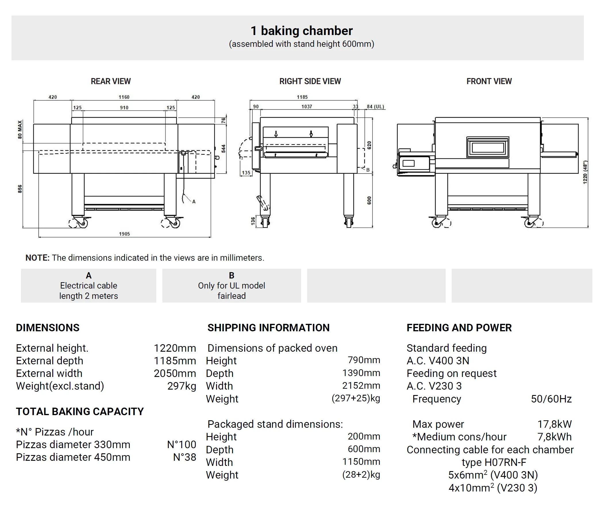 TT96E, the electric modular conveyor oven, is composed of one or more stackable baking chambers and an optional stand. During baking, the product is placed on the conveyor belt and passes through two flows of hot air: impingement technology, the best system for heat distribution in the whole baking chamber for perfect baking of pizza, pastry, bakery, and gastronomy. Management of needed power is automatic according to the load. The power control of ceiling and floor is independent and managed by two probes. The conveyor speed is adjustable. Efficiently insulated and isolated, the external surfaces are cool even during use. The baking chamber maximum temperature is 320°C (608°F).