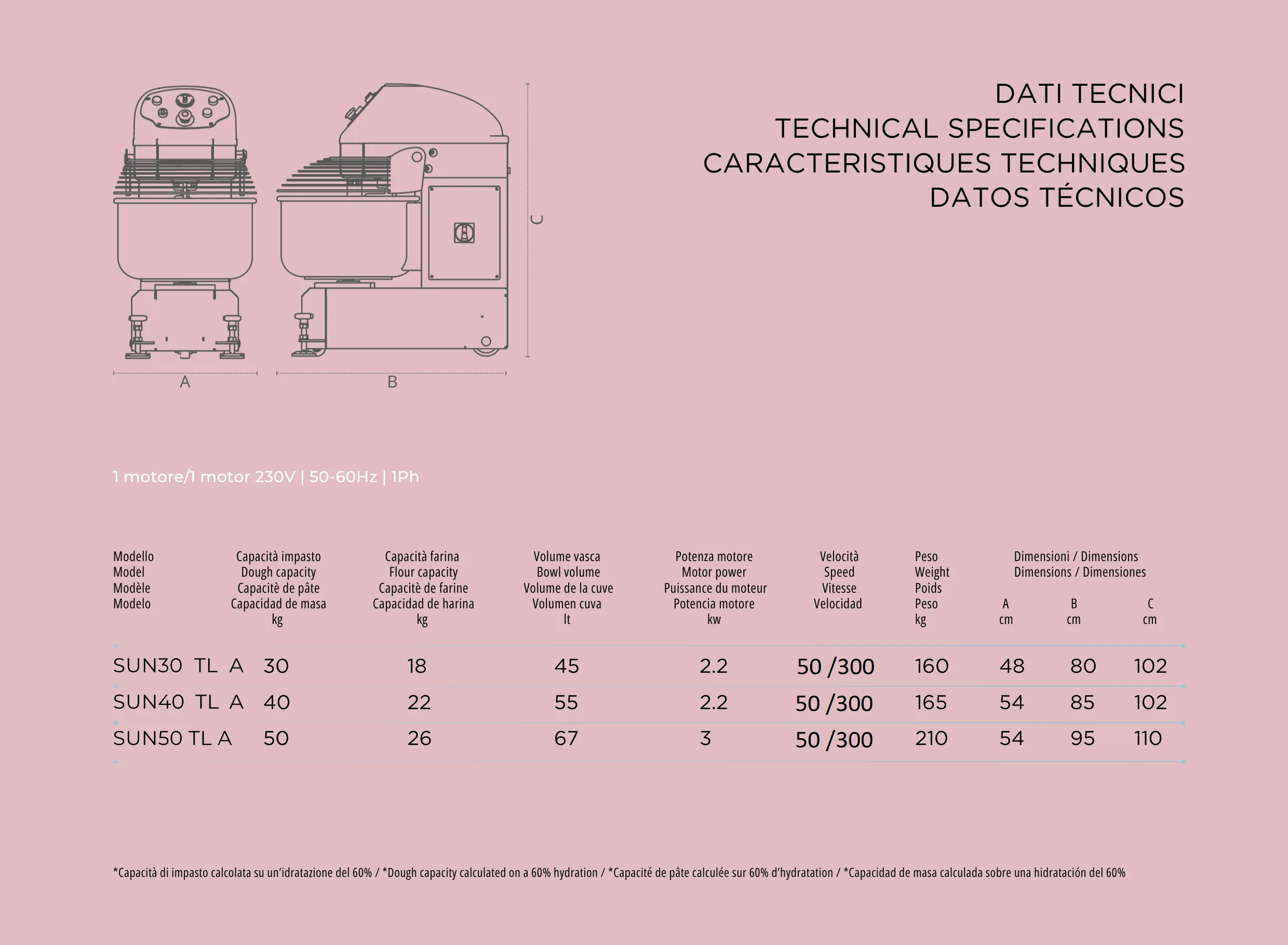 Available in different capacities from 30 to 50 kg of dough, it is ideal for doughs starting from 60% hydration and allows you to knead even small quantities.